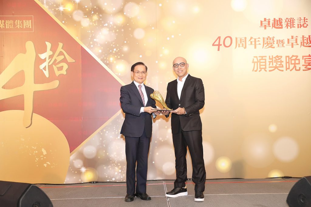 武恩德營造(右)獲頒【公共建設與社會貢獻菁英獎】,董事長潘學恩(右)與商 業發展研究院許添財董事長(左)合影。